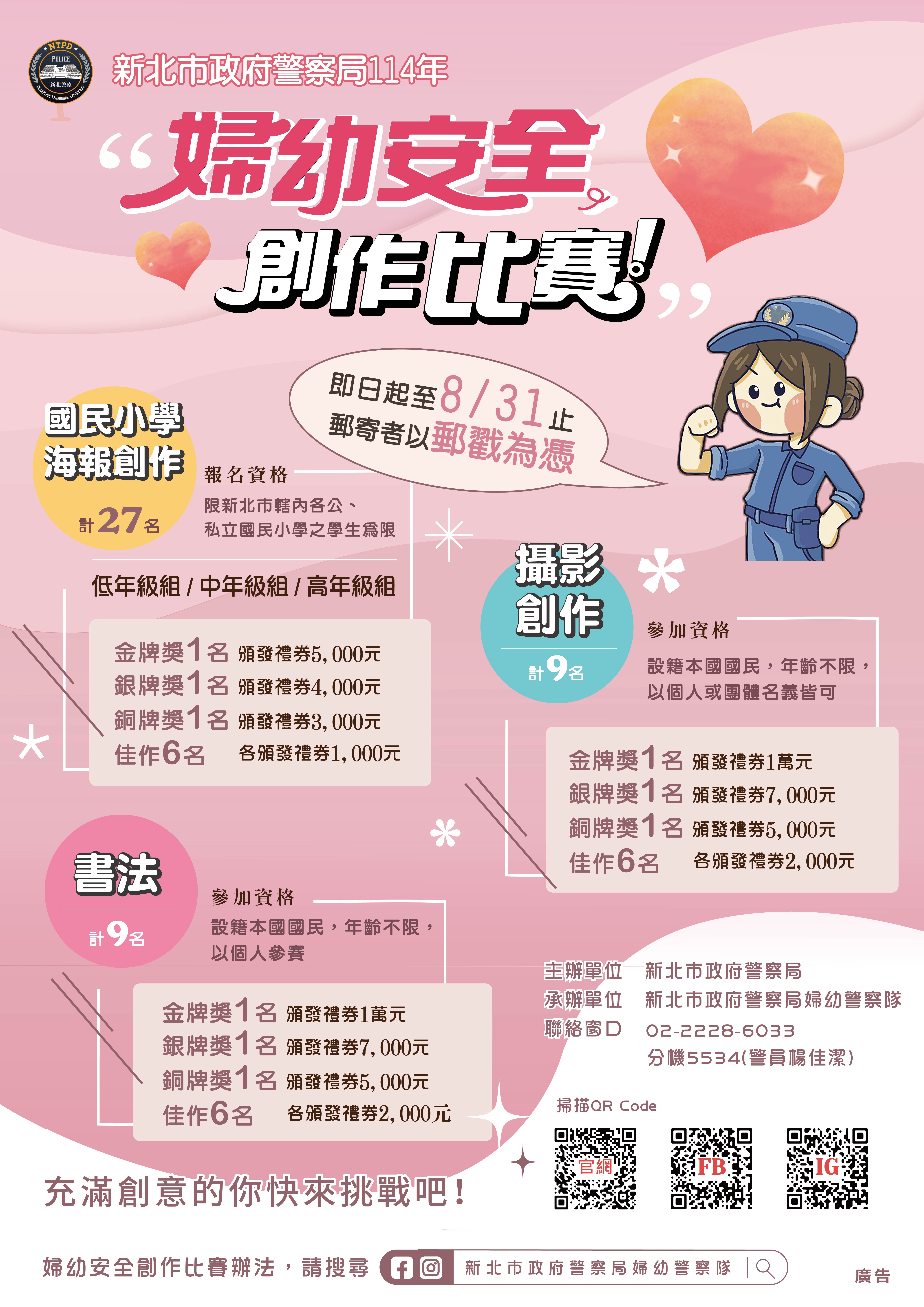 新北市政府警察局114年婦幼安全「國小海報創作」、「攝影創作」及「書法創作」比賽開跑囉! 透過創意發揮,啟發孩童對於婦幼安全觀念且獎品豐厚,熱愛創作的你還在等什麼呢?比賽報名自即日起至114年8月31日止(以郵戳為憑)。 |