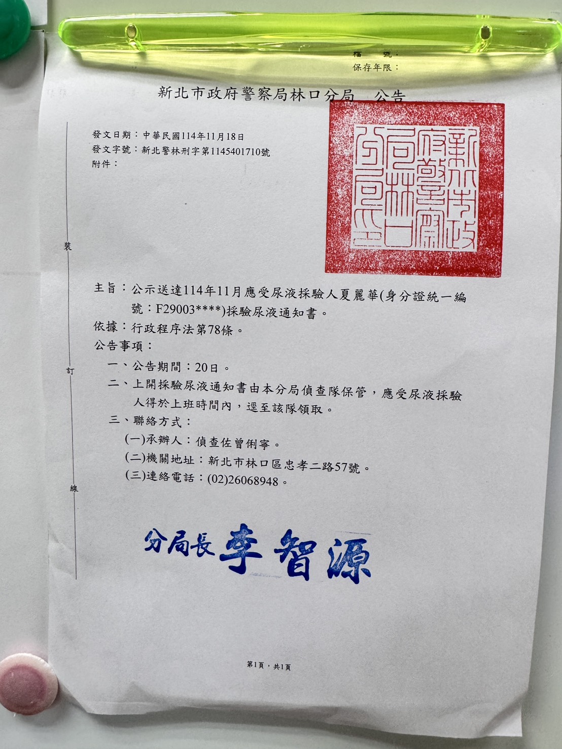 林口分局公告-應受尿液採驗人夏麗華採驗尿液通知書